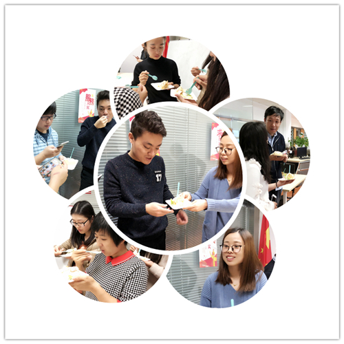 由于我们的田总会议缠身,所以单独和蛋糕合影留念后马上又投入到工作中啦。会议室里大家点上蜡烛,唱起那熟悉又温馨的歌谣,把祝福通过歌声传递给寿星们。随后由我们的俞总切下了第一块蛋糕,我们的明明姐亲手把蛋糕分到大家手上,分享祝福给大家。