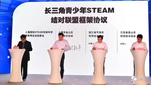 同时,长三角三地STEAM联盟签约仪式举行。到会的7名入选国家“万人计划”的科技工作者精彩亮相,并发起了进一步致力金山经济社会发展和科技进步发展的倡议。