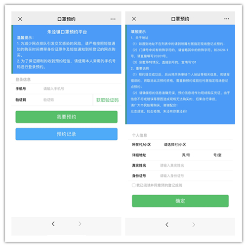 居民通过手机微信扫描二维码,输入手机号、住址、身份证号等信息后,短短1分钟,顺利完成口罩购买的预约登记。接下来只要等收到“提货通知”,就可以去指定药店购买口罩。