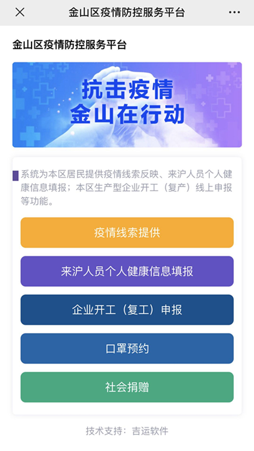 “为做好新型冠状病毒感染的肺炎疫情防控工作,由我司助力整合开发的“金山区疫情防控服务”微信小程序(1.0),于2月10日正式上线运行。金山区居民、企业可在线进行“疫情线索提供”、“来沪人员个人健康信息填报”、“企业开工(复工)申报”、“社会捐赠”等操作,为居民、企业与政府间搭建了一条“不出门、不见面”的沟通渠道。”