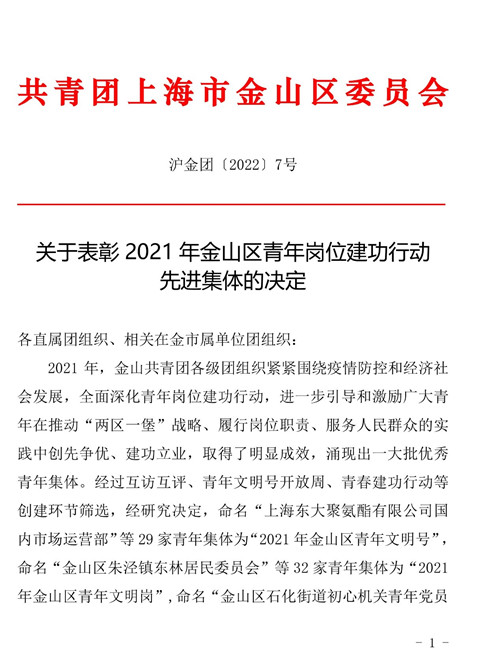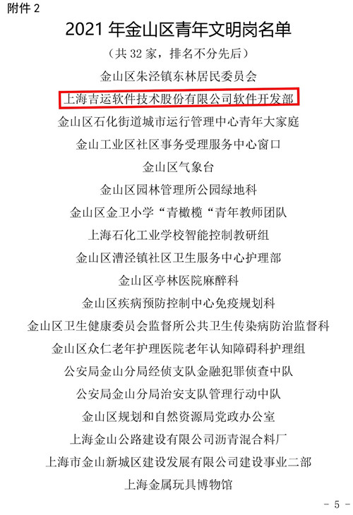 近日,团区委发布了《关于表彰2021年金山区青年岗位建功行动先进集体的决定》。我司软件开发部获评“2021年金山区青年文明岗”称号。