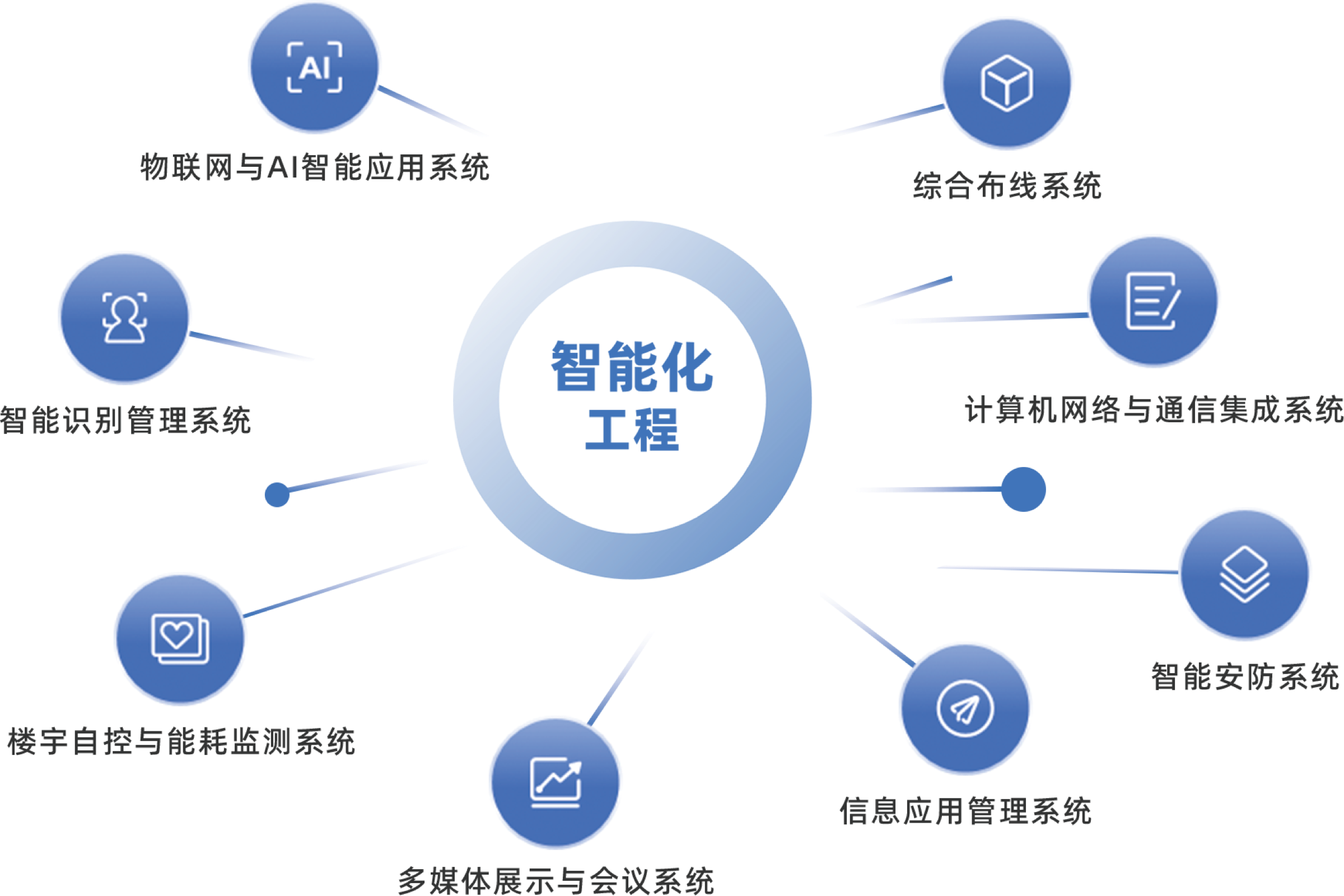 涵盖智能化集成系统、信息化应用系统、建筑设备管理系统、安全技术防范系统、智能卡应用系统、